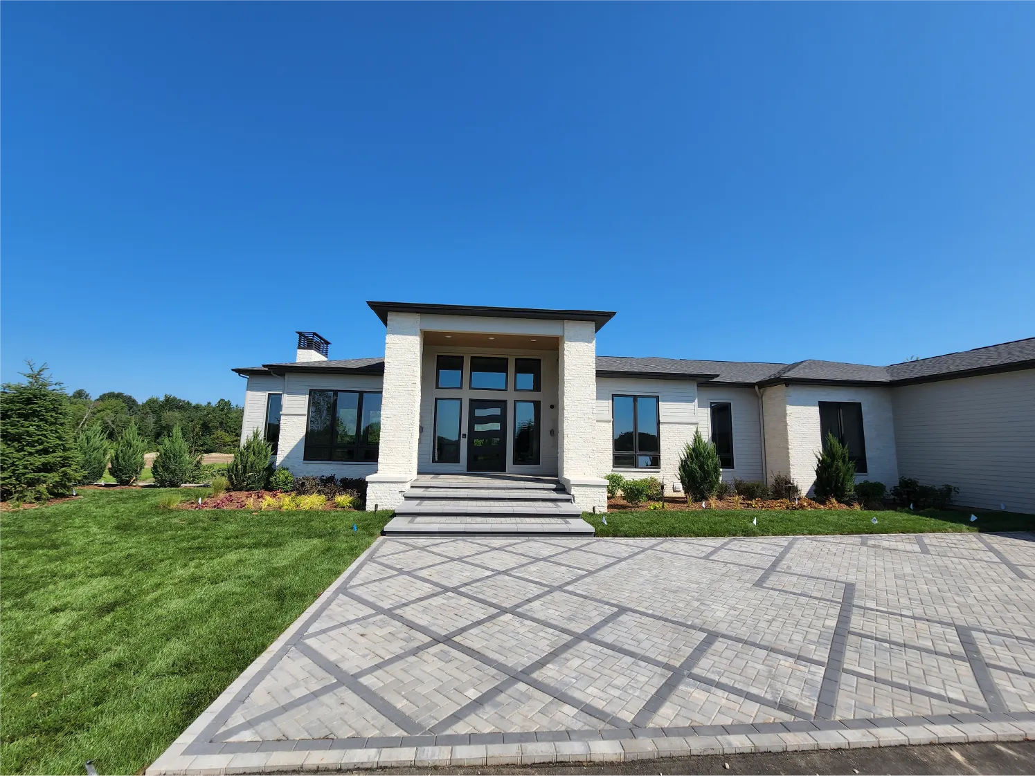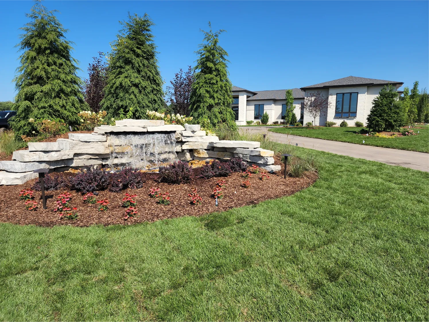 The driveway entrance features intricate brick patterns and a central island accented by waterfalls on three sides, providing a memorable first impression for visitors.