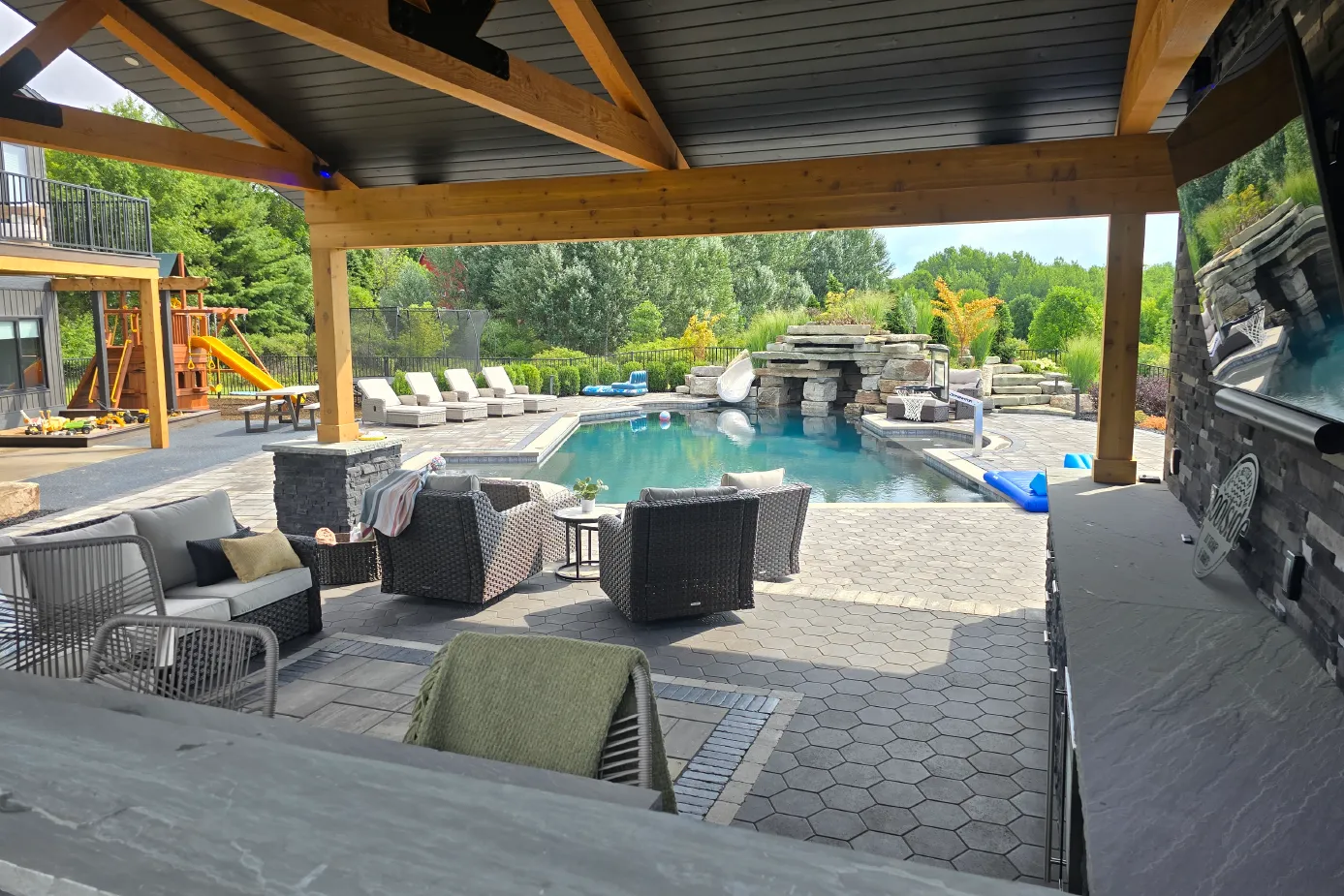 This project combined nearly all of our services to create a functional, cohesive backyard built for both entertainment and everyday use. The space includes a pool with slide, firepit, pergola, lighting and sound systems, pavers, stonework, water feature, and full dirt and grading work.