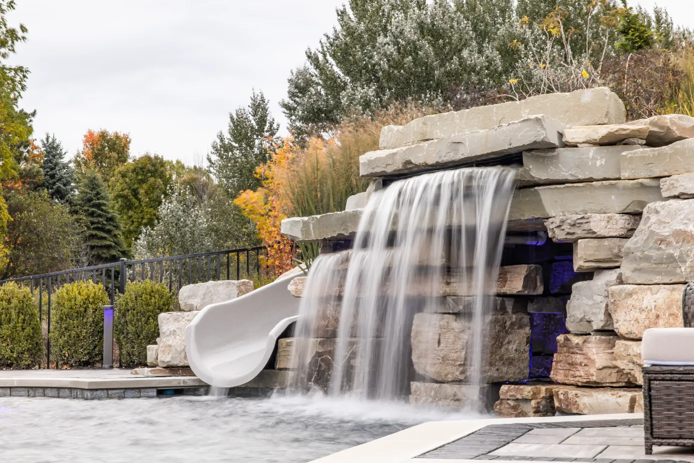 The custom pool features a slide and an adjacent fountain, adding both play and visual interest. Surrounding stone and pavers provide durability and clean lines.