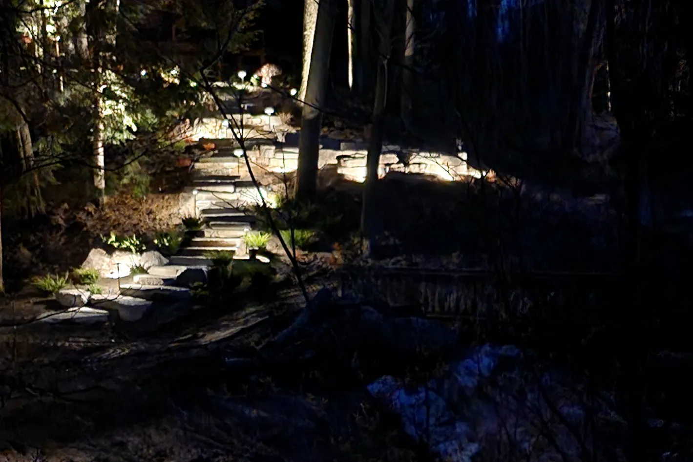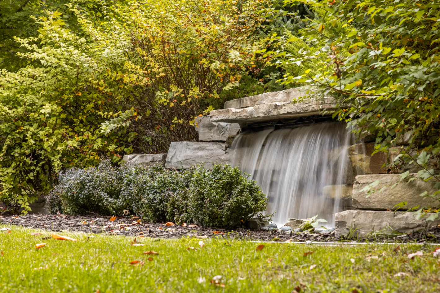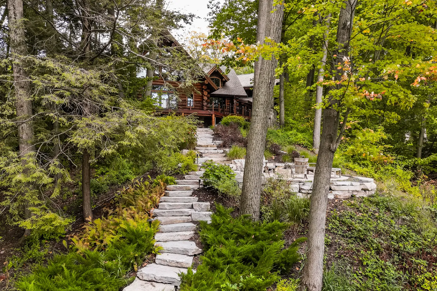 Natural stone outcropping walls and accents blend seamlessly with lush plantings to shape a welcoming and enduring design. Together, they create a “welcome home” feel that reflects the beauty of the surrounding forest.
